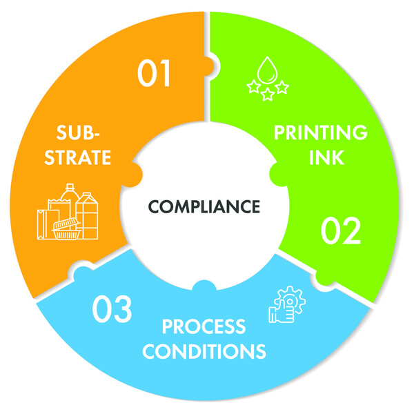Det er ingen enkelt farge på markedet som er universelt egnet for all matemballasje. Overensstemmelse må alltid vurderes ved hjelp av det ferdige, trykte matkontaktmaterialet, da migrasjon påvirkes av selve substratet, farge og prosessforhold (se figur 4).
