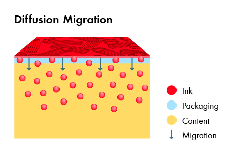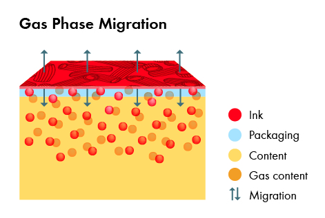 Farge trykt på emballasje kommer i indirekte kontakt med mat, og det er derfor mulig at stoffer som er inneholdt i fargen, migrerer til innholdet (for eksempel via diffusjon, avstenging eller gassfase-migrasjon, se figur 1-3). Migrasjon er sterkt påvirket av substratets funksjonelle barriere. Jo bedre denne barrieren er, desto lavere er potensiell migrasjon.